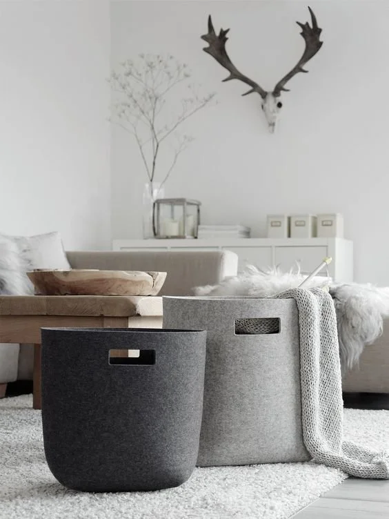 Add some baskets in the living room for winter throws or bits and pieces that find their way into your living space. They're' handy when a quick clean up is in order.